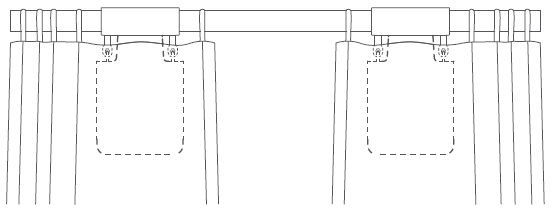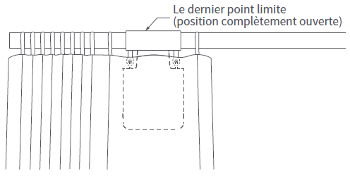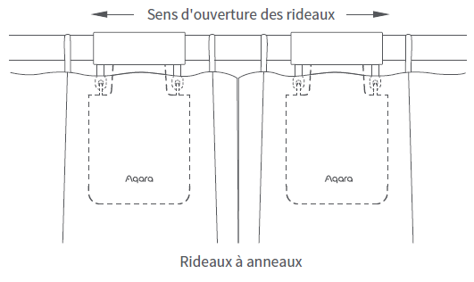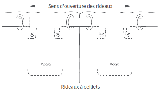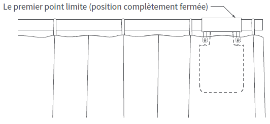 - Tirez les rideaux sur les côtés gauche et droit jusqu'à ce qu'ils soient complètement fermés et installez les deux Moteurs Rideaux à l'endroit du rail où les rideaux sont complètement fermés, conformément à la méthode d'installation des "rideaux simple face".